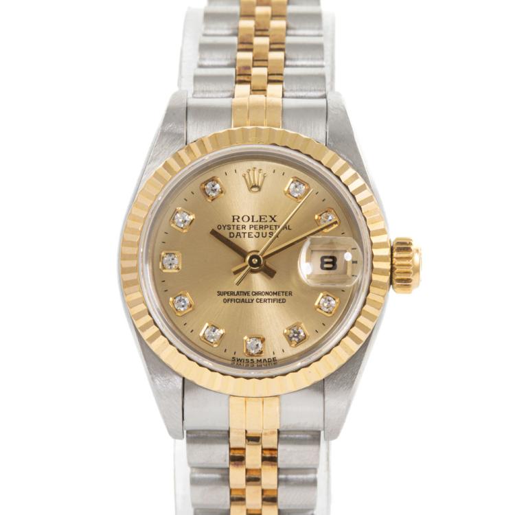 Rolex Oyster Perpetual Datejust 18ct yellow gold and stainless steel automatic ladies watch. Gold dial, Diamond indicators, date, case diameter: 26cm, wrist size: 15.5cm, Swiss made. Ref# 69173G. Circa: 1996. With Rolex two tone Jubilee bracelet and clasp. With Certificate of Authenticity and Rolex box. 3 month FSA warranty (Pre-owned)