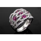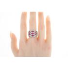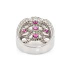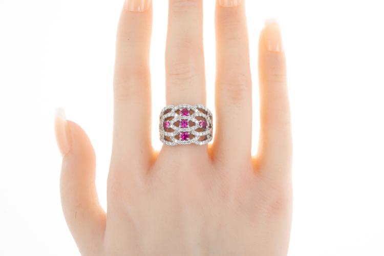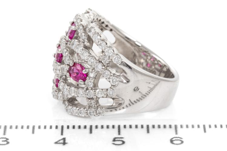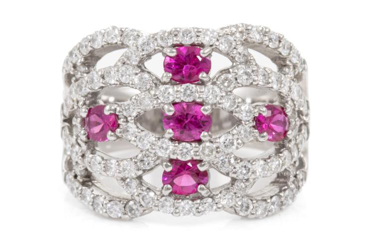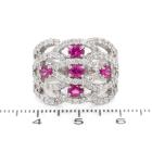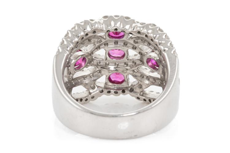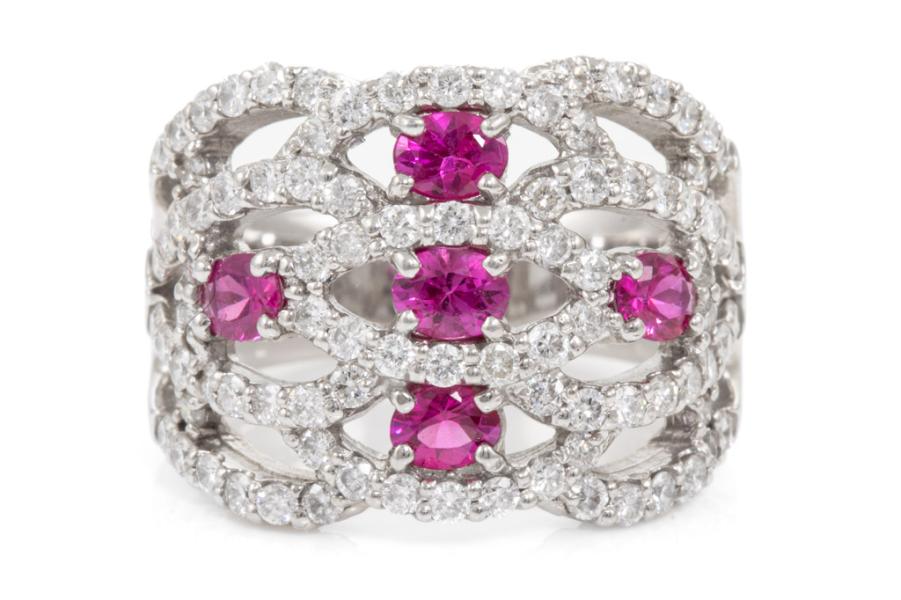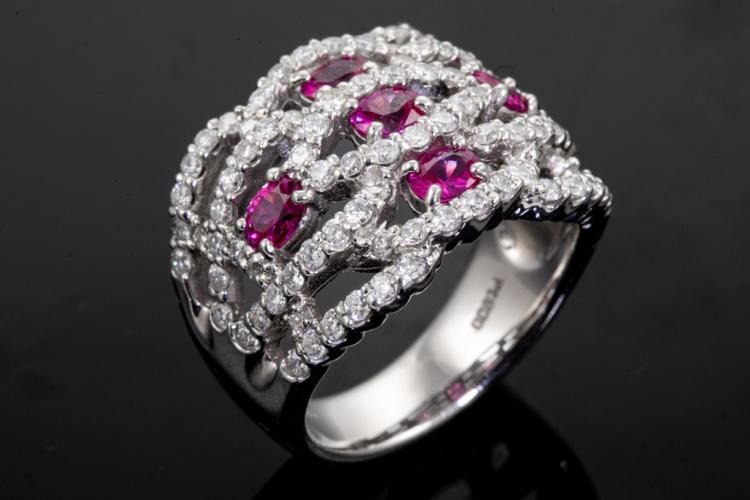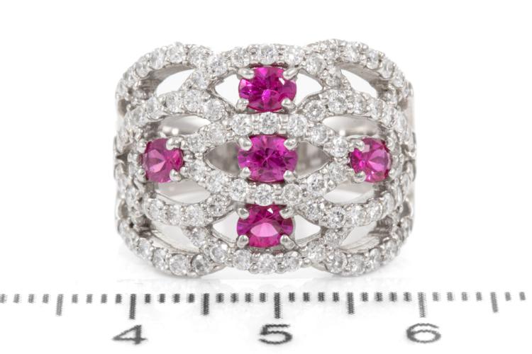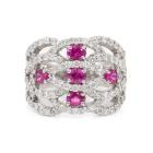 Ruby and Diamond ring with 5 oval Natural Rubies totalling 0.96ct and round Natural Diamonds totalling 1.40ct (Estimated grading: G-H SI). Platinum - 900. Ring size M. Band width: 5.5mm - 6.8mm. Weight: 15.7g. (Pre-owned)