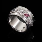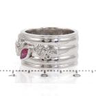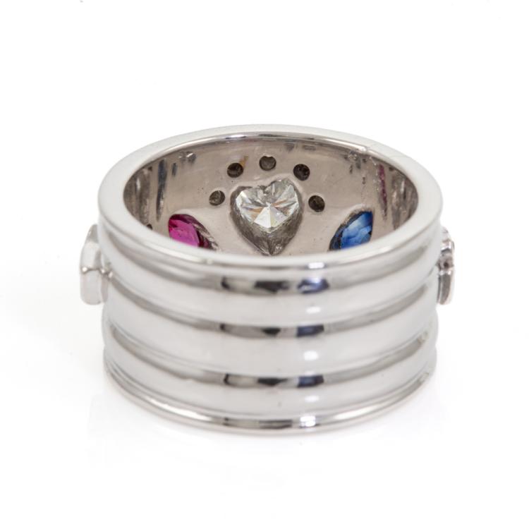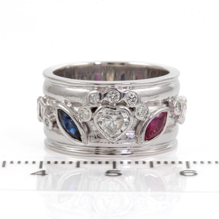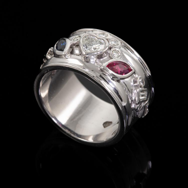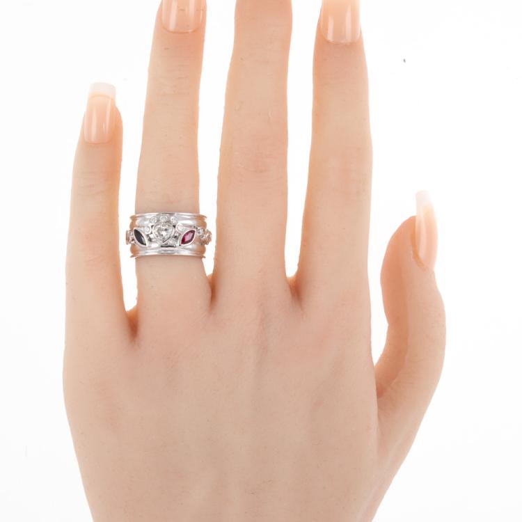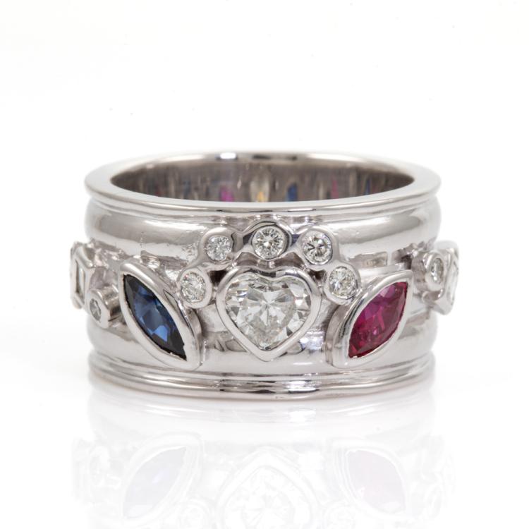 Ring with marquise cut Natural Ruby and blue Natural Sapphires totalling approximately 0.50cts and round, heart & baguette cut Natural Diamonds totalling approximately 0.70cts (Estimated grading: H SI). Ring size J. Band width: 10.6mm. Weight: 13.9g. (Pre-owned)