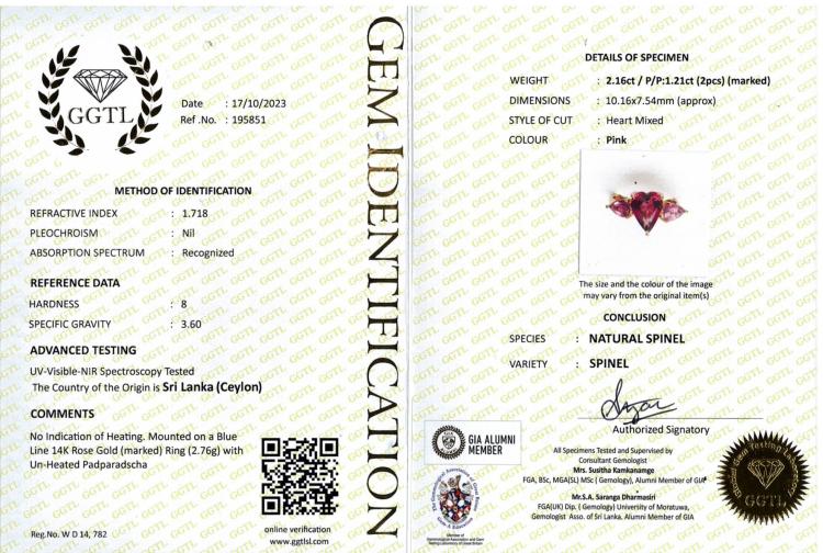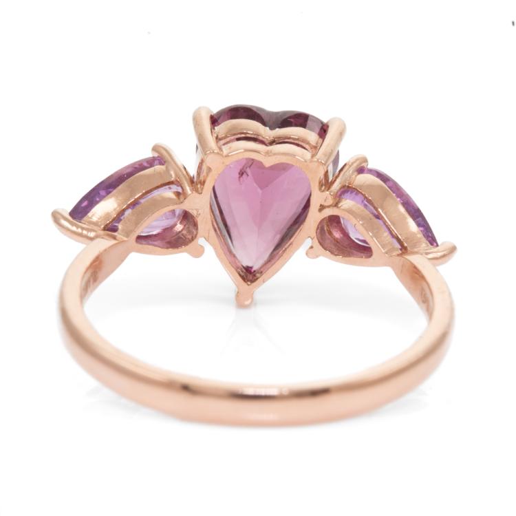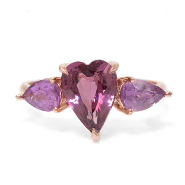 Spinel and Sapphire ring with a heart shape purplish pink Ceylon Natural Spinel of 2.16ct and pear shape unheated pink Natural Sapphires totalling 1.21cts. 14ct rose gold. Weight: 2.7g. Band width: 2mm. Ring size L1/2. Band width: 2.1mm - 1.9mm. With GGTL report #195851. (As new)