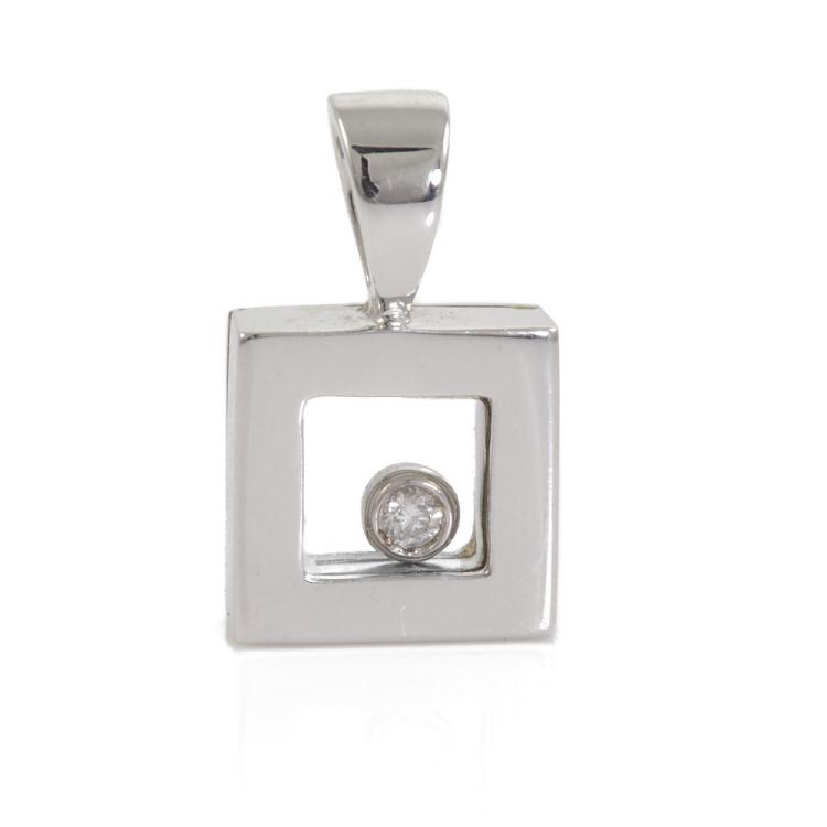 Square shape pendant with a floating round Natural Diamond of approximately 0.03ct. 18ct white gold. No chain provided. Size 9.9mm x 16.9mm. Weight: 4.2g. (As new)