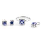 Three piece Tanzanite set: incl. 1) Tanzanite ring with centre Natural cushion cut Tanzanite of approx. 0.87cts (5.9mm x 5.9mm) & Natural Diamonds totalling 0.15cts. Ring size O. 9) Tanzanite earrings with cushion cut Natural Tanzanites totalling approx. 0.48cts (4.0mm x 4.0mm) & Natural diamonds of 0.15cts. 3) Tanzanite pendant with cushion cut Natural Tanzanite of approx. 0.51cts (5.0 x 5.0mm) & diamonds totalling 0.10cts. 9ct white gold. Combined weight: 5.0g (As new)