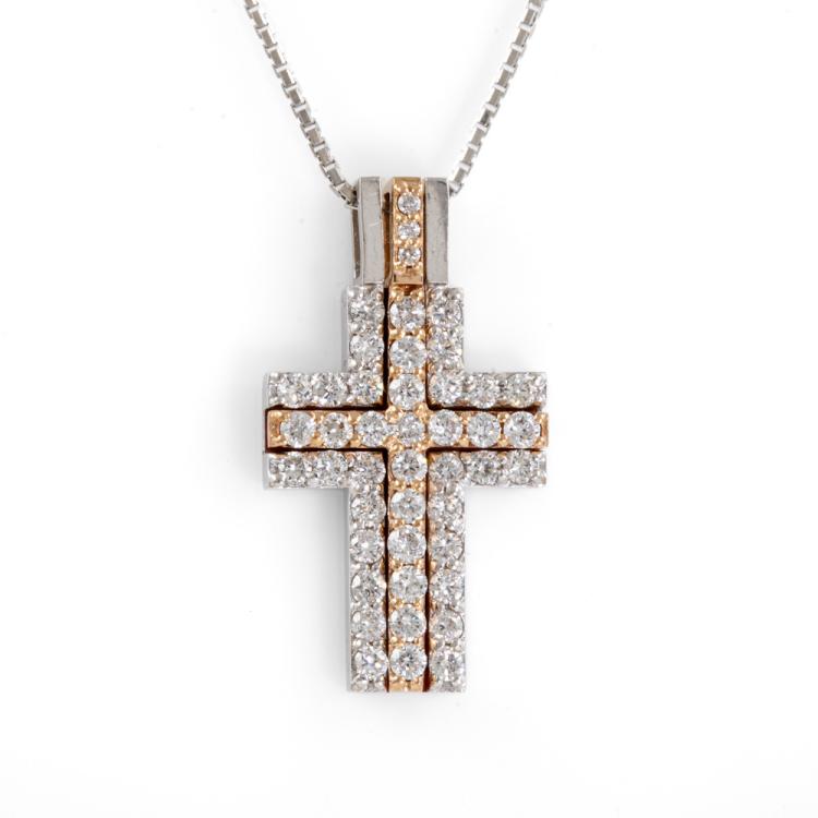 Diamond cross detachable pendant with round Natural Diamonds totalling 0.75cts (Estimated grading: G-H SI). One cross is of Carnelian & Diamond. The second cross is of diamond only. The diamond cross fits into the Carnelian cross, so they can be worn as one or as two different crosses. 18ct white and yellow gold with 18ct white gold adjustable 45cm chain. Weight: 6.3g. (Pre-owned)